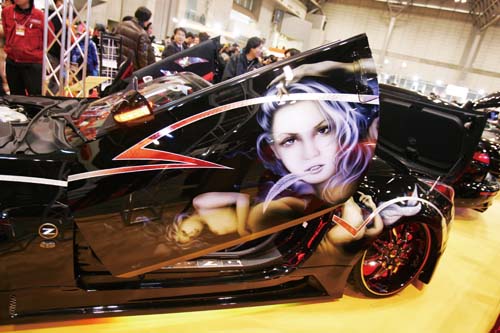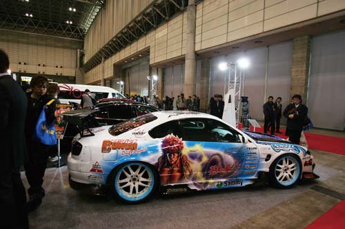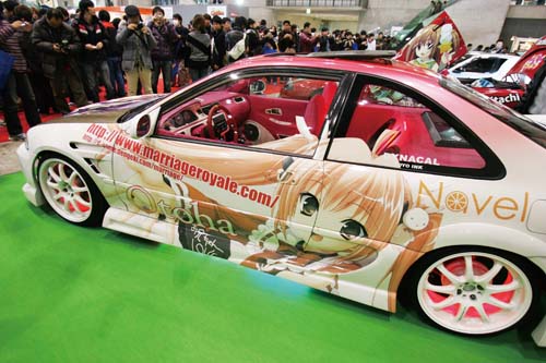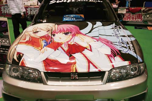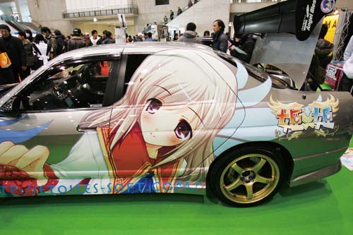 「痛車」一詞,說真的對於第一次見到這名詞的人來說,還真搞不清楚到底所指為何(包含筆者在內),完全無法與車身彩繪聯想在一起,直到後來接觸到愈來愈多的資訊後,筆者才慢慢瞭解到原來「痛車」,所指的就是彩繪了「萌系」動畫人物的改裝車,且多數皆以女性角色為主,當然也有帥氣的男性角色,像這次Auto Salon裡就有車身上出現相當華麗的蒼天之拳中主角「拳志郎」的彩繪。