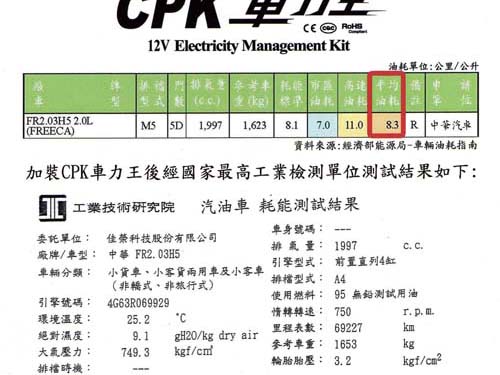 | 工研院檢測報告顯示,CPK車力王對於油耗有著27.7%的理想省油效果。 |