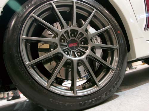 | 18吋鑄造鋁圈配上Bridgestone RE070輪胎,此車的所有配備都是為了「Racing」。 |