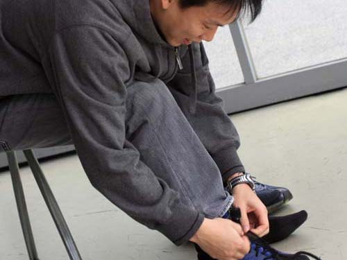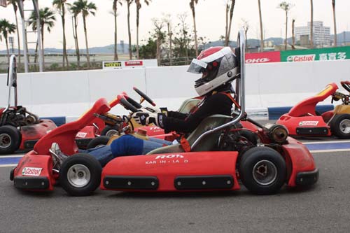 首先由陳乃嘉示範男生的部分,陳乃嘉特別在駕駛Go-Kart前換穿賽車鞋,主要的原因是因為一般的鞋款底部較厚,對於油門與煞車踩踏的深度較難控制,所以才需要換穿薄底的賽車鞋,不過陳乃嘉表示,車友於初期接觸Go-Kart時並不需刻意要求這個環節,不要穿拖鞋或涼鞋即可。