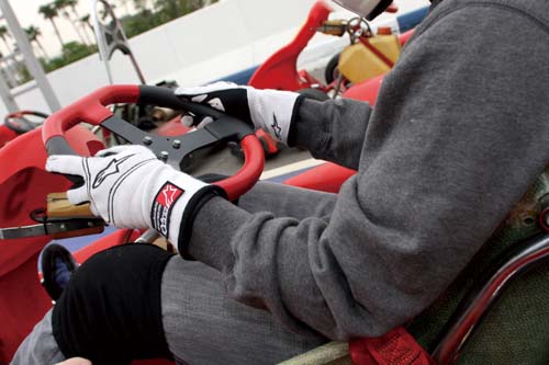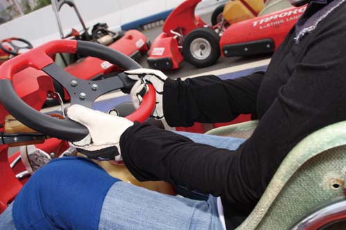 盡量準備自己慣用的手套,可以讓你更容易抓緊方向盤,而握著方向盤時,兩個手肘必須是彎曲的,如此一來才能靈活轉動方向盤,而方向盤的轉動方法會改變路線,以陳乃嘉而言,較緩的彎會用推的方法、較急的彎會用拉的方式,不過每個人轉彎的方式不盡相同,只要找到最精準的過彎方式就對了。再來是駕駛Go-Kart的重點,各位一定注意到、卡丁車的油箱一定是在兩腿之間,而為了有效固定身體,兩膝會牢牢夾緊油箱,這也是為什麼兩位老師都會穿戴護膝的原因,筆者一直忽略這個重點,所以當晚回家才發現膝蓋已經淤青了。