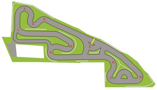 | 1.全油門進出彎。 2.入彎前煞車,進彎時全油門。 3.保持全油門。 4.保持全油門。 5.Apex點收油約1/5,然後立刻全油門。 6.入彎前煞車,然後立即全油門進彎。 7.保持全油門。 8.保持全油門。 9.過路面不平處煞車,然後漸進式踩油門。 10.入彎前煞車,然後全油門。 |