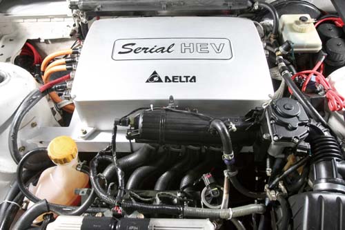 打開這部試裝車的引擎蓋,立即會發現這部車的不同之處,原本BMW的引擎與變速箱被移除,換上由台達電自製的串聯式Hybrid動力系統。所謂串連式Hybrid動力系統乃是單純以馬達驅動車輛,小型內燃機引擎則僅用以發電,作為電動馬達的動力來源。