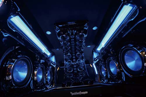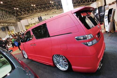 這部外觀為深粉紅色的Van,由於筆者與它相遇的時,正好拿著DV拍一個妹,因此對它的第一印象並不深刻,只覺得其整體配色相當完整,從頭燈、引擎蓋、前後車門到尾門等,皆採用同一色系烤漆,有著相當不錯的改裝完整度,本想換攤位繼續拍妹時,突然聽到本刊攝影提醒我說,這部車包了一層皮,要不要多拍一點,此時才發覺「代誌大條了」!竟然是部包皮車,還好攝影有提醒我,再走近一點看,哇賽!全車還真的包了一層皮,而且從車頂、引擎蓋到前保桿上所包的皮革還是沙發材質,按下去還會軟軟的,這樣的觸感會發生在一部車上,心裡的感覺還真是不習慣。