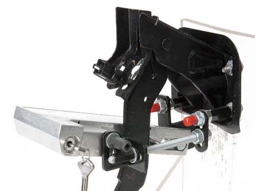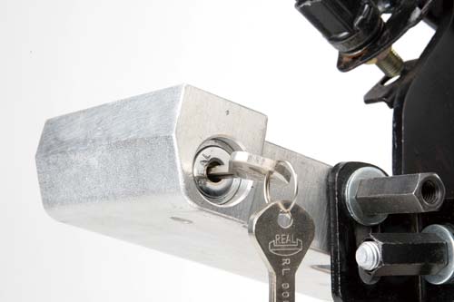 嚴格來說,這一套機械防盜鎖已經進展到第三代,不但歷經多次改良與測試,取得國家專利,更舉辦100萬元挑戰開鎖拿獎金,就算破壞到只剩下鎖心,仍無法解開防盜鎖,達到確實的防盜功能。將鎖桿、彈簧與鎖心等機件整合於一體成型的鋁合金機殼內,鎖心、鎖桿與螺絲帽全數通過測試認證,不容易被破壞也不至於造成使用上的危險,而內部作動的彈簧是採用德國鋼材製成,通過2160小時的壓縮測試,用十年也不會壞。作動原理非常簡單,只要壓下鎖心、內部鎖桿即會凸出擋住煞車踏板,無法踩下煞車踏板就無法發動,藉此達到防盜目的,而且安裝簡單,可按照說明書DIY安裝!