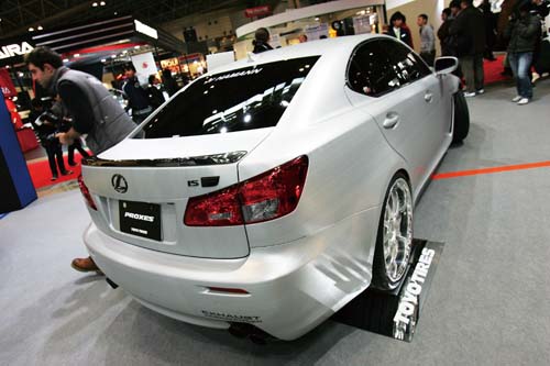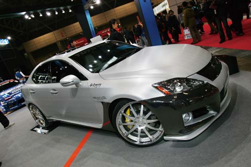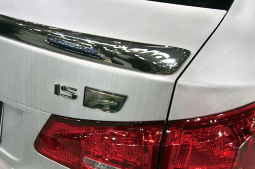 這部IS-F遠遠看去沒啥特別的,不過走近一看才發現其鈑金上的烤漆,竟然有著鋁合金原色的髮絲紋路,整部車除了前保桿為鏡面電鍍表面外,其餘的部位從水箱護罩、引擎蓋、車頂、行李箱蓋後保桿、照後鏡到車門等,全部皆採用髮絲紋路的手法,將鋁合金原色的烤漆塗布上去,整部車看起來就像尚未烤漆般,且實際以手指觸摸漆面,發現其上確實也有著些微凹凸不平的觸感,是相當創新的烤漆技術,給人低調中帶些奢華的視覺感受。