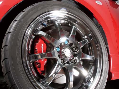 | 17吋Work XD9鋁圈、AD08輪胎與Brembo對向四活塞煞車組,底盤已做好對應MPS動力的配備 |