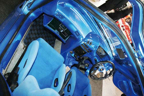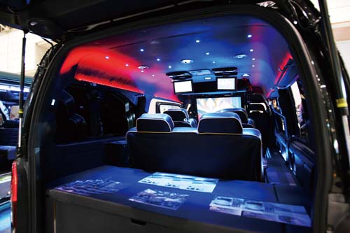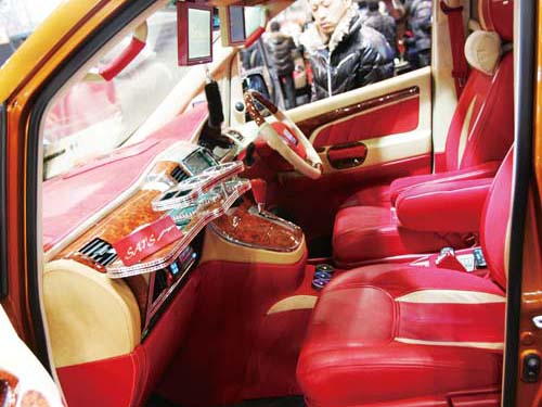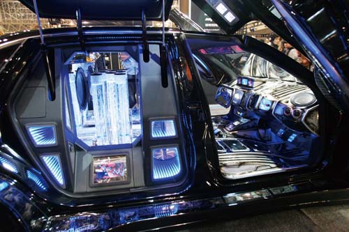| 這部是由Lexus LS430所打造的視覺系改造車,前座整個原廠中控檯竟被一組手工打造的部品所取代,且方向盤還改在中間位置,至於後座則被發光的冒泡水族箱與重低音箱佔滿空間,改裝幅度同樣很大。 |