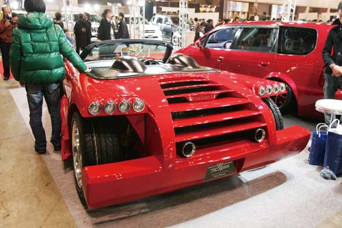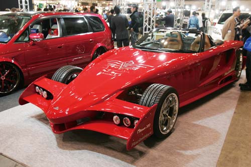 這部外型長得相當特殊的車,放置的地點就位於出入口處,因此三天的展覽時間裡,總是駐足著許多日本車迷圍觀,是會場中相當引人注目的一部。車頭看似以方程式賽車為範本所打造,擁有方程式賽車才有的圓錐形車頭、左右上下雙層前下擾流翼,且前輪還直接露在車體外,並未額外設計輪弧蓋包覆,確實有著相當顯目的外型。至於車尾則採用厚實的線條打造,中央設有多道漸層式橫向散熱孔,除可協助中置引擎散熱之用外,還可增加車尾整體的視覺張力,且排氣管亦相當巧妙的安裝於最下方的散熱孔上,透過左右雙出設計,期盼能賦予本車更競技的風格。