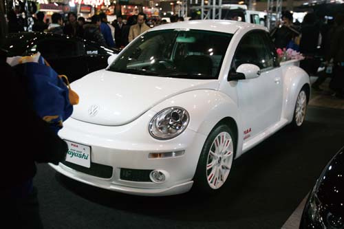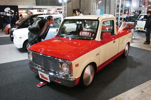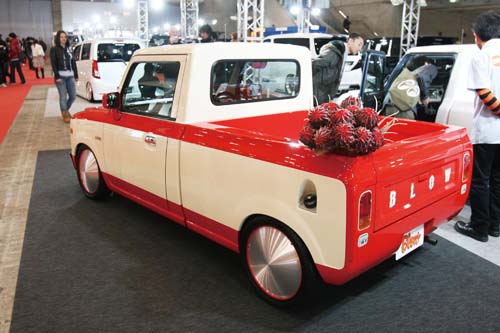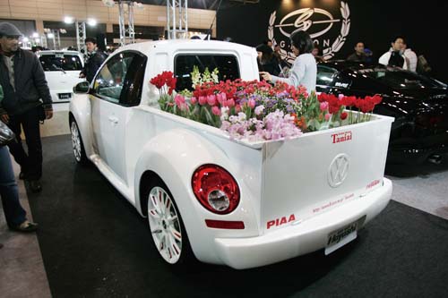 在會場的一角筆者發現有兩部外型長的相當可愛的小貨卡,一部是由金龜車所改造而來,另一部則是由名為Blow的車輛所改裝而來,前者由於Beetle原本的外型便已相當可愛,因此即使將後座改成車斗後,依舊保有原先圓潤的造型,連尾燈都保留下來,再加上車斗裡又放滿各式美麗的花朵,因此更家討人喜愛。至於另一部貨卡,雖然外型沒有像Beetle這麼討喜,但經過Tuner的巧手,幫它加裝了全覆式鋁圈、電鍍雨刷臂/水箱護罩/前保桿,以及雙色烤漆,同樣使其展現出令人耳目一新的感受。