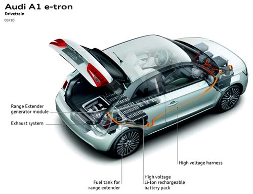 A1 e-tron將電動馬達安裝於前軸,充電與馬達所需的機械結構安裝於引擎的位置,電動馬達則以T字形安裝於後座與中央鞍座下方,而在行李廂下方的備胎位置則裝上一具排氣量僅254c.c.的轉子引擎作為發電之用。