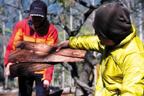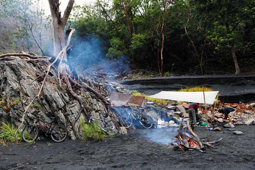 扛車翻閱岩石、涉水過溪多次之後,或騎或扛的不斷緩慢前進,天色漸晚而且天候開始轉壞,但居然看見竟然有人在這裡的溪床上玩著搭乘卡車內胎或膠筏漂流的遊戲,原來他們是巴庫拉斯民宿的遊客,這種天候、季節願意來玩水的,大概只有像他們這樣夠瘋狂的年輕人才會來。看著他們流走後,溪谷裡只剩下我們幾個牽車的傢伙。必須趁著下雨前找好營地,其實也不難,這條溪谷地形夠格的營地遍地皆是,所以我們還可以挑剔一番,最後選定一顆大樹下;取水也方便的位置紮營,現在不是颱風季節,應該不會有暴雨發生,所以即使天空下著小雨也還算安心。
