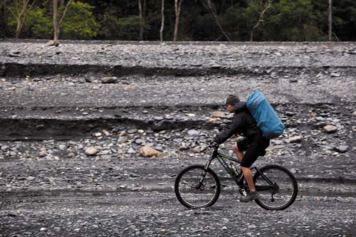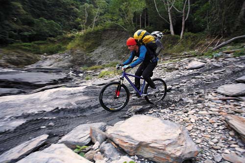 在充滿沙石的溪床上騎車當然不好騎,而且不時還得扛車涉水過溪,但在這樣的天然環境下,這些苦差事也變成樂趣之一。