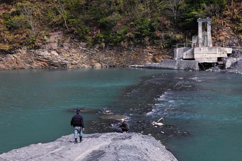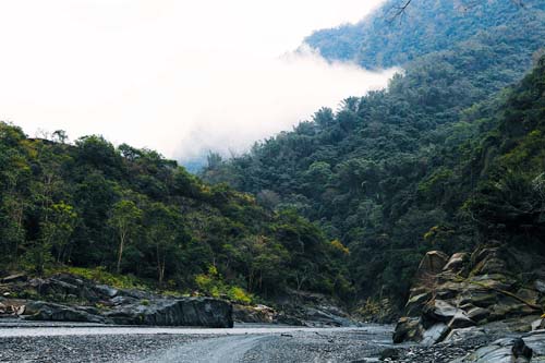 其實接下來的路況對騎單車而言,根本就是苦差事一件,至於是否有樂趣嘛,則因人而異。喜歡原野、不在意穿著溼衣物、露宿溪床野外的話,那麼來此有開闊的營地可以選擇,有撿不完的漂流木可以生營火,也有騎不完的溪床等著你。若以上皆非,那麼進入溪床後還是不要再往上游或下游前進了,因為接下來的路況能夠暢快騎行的距離很短,但是一定要扛車涉水過溪,甚至扛車跨越岩壁高繞,若只是來此溯溪釣魚,那麼就不算辛苦,但若要在多帶一輛單車,除非穿著硬底涉水鞋騎車,溼了也無所謂,不然一點也不舒服。