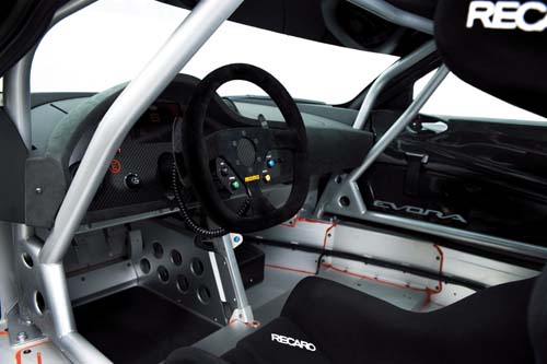 | 競賽用途的車艙卸下所有不必要的零配件而露出全鋁合金製作的車體,整部Evora Cup賽車減輕了200公斤的重量 |