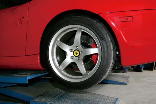| 此部Ferrari 575被頂高機撐起時,可以明顯看出後避震器有多短,輪胎與輪拱的距離幾乎沒有拉長。 |