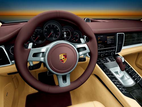 | 內裝組件維持與V8車款相同的高質感,值得注意的是這具跑車化方向盤首見於小改款911 Turbo,Panamera Turbo發表當時並未出現 |