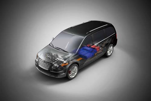 | 在未來十年的日子裡,配置「可充電混合動力」的Plug-in Hybrid車款將大行其道,畢竟純電動車性能有限,對於美國、中國大陸這種「大陸型國家」並不適用。圖中的Chrysler概念車清楚地闡釋了「次世代汽車」的主流設計,引擎與馬達並存在動力艙內,藍色的部分是電池、它被安置在車艙底板下方以降低重心,紅色部分是油箱,由於耗油量大為降低,因此容量也從原本的65公升下修至30公升。 |