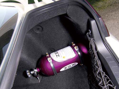 答案是「有」!前兩三個月,Option才幫剛請ECU TEK寫過電腦的這輛車,測出14.48秒的100~200km/h加速成績,證明了車主在ECU TEK身上砸的錢沒白花,沒想到過沒兩個禮拜,一組空運來台的ZEX Nitrous笑氣加速系統又悄悄的被裝到車上。整組重量僅11.8公斤的笑氣加速系統,乃專為’07年之後的350Z(當然就包括G35)所搭載的VQ35HR雙節氣門引擎所設計,該系統可與電子節氣門同步做動,並接收油門深淺的訊號,釋放出等比例之「濕式笑氣」。而安裝的方法很簡單,只要在進氣肥腸上鑽兩個小洞,把笑氣噴嘴鎖進去,電子節氣門電路接一接,再於室內找個地方裝開關,固定一下氮氣瓶,就能輕鬆為VQ35HR帶來75~100HP!