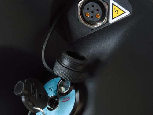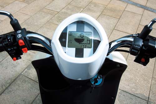 | .「電氣二輪車e-moving」龍頭特寫,充電座位於電門鑰匙旁邊,此設計可以確保騎士在上路之前一定會看到連接的電源線、而不會將整個充電站拖著跑 |