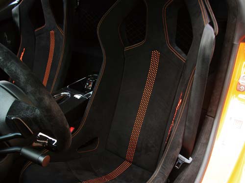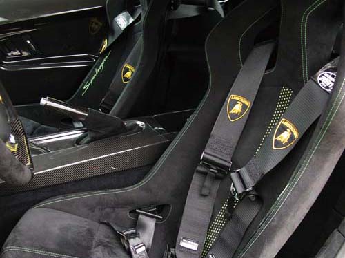 | 車內兩張賽車椅的造型設計與全球限量20部的Reventon雷同,使用麂皮包覆且車縫線採取與車身同色的搭配方式。 |