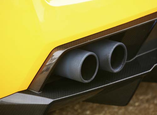 | 後保桿下方的分流器同樣為碳纖維製品,排氣尾管則採用特殊的隔熱消光黑塗裝 |
