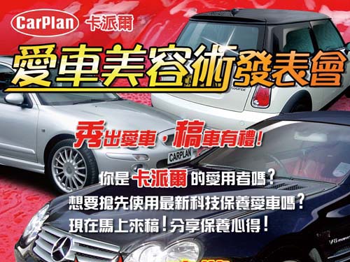 您是CarPlan卡派爾的愛用者嗎?您有一手愛車美容保養的功夫嗎? 您迫不及待想與廣大網友分享您的絕技嗎?現在正是大秀好身手的好機會,即日起至6月20日,只要在《愛車褓母》汽車美容保養俱樂部發表CarPlan卡派爾美容產品使用心得,您就有機會搶先得到即將上市CarPlan卡派爾 Demon 紅魔鬼系列產品,想要免費搶先使用千萬不要錯過這次機會唷!