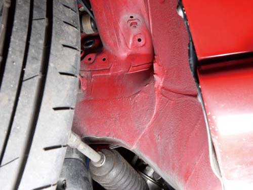 | 紅色圈圈部分就是剛剛所提到底盤的鈑件接合處,一般烤漆店並不會特別幫車主處理該部分,車主可自行購買鈑金膠或是大包膠來自行施打,不過比較不划算的就是這兩種膠,打開後並須盡速用完,不然很快就會乾掉 |