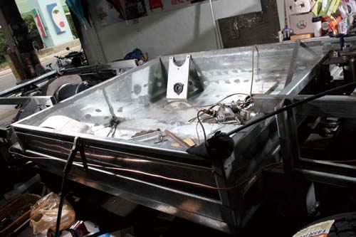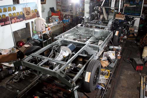 過了一個月的時間,原本只有骨架的水陸兩用車已逐漸完成。如同原先所設定的方式,後輪採用Subaru GC8全新五速手排變速箱,搭配一具來自高爾夫球車、擁有52hp馬力的電動馬達,變速箱與馬達連接俗稱「獅仔頭」的部分,採用訂製方式完成並與前方排檔機構連結,而後方的動力槳將會連接於變速箱下方。前輪部分較為特別,最終決定使用一具30hp的電動馬達,作為上岸或是輔助動力之用,在獨立作動、不需換檔的情況下,馬達使用鏈條直接與差速器串連,再通過訂製的傳動軸將動力輸出,所以此部水陸兩用車是四驅設定,但不是全時四輪傳動,而負責控制前輪馬達作動時機的電腦仍在努力趕工之中。