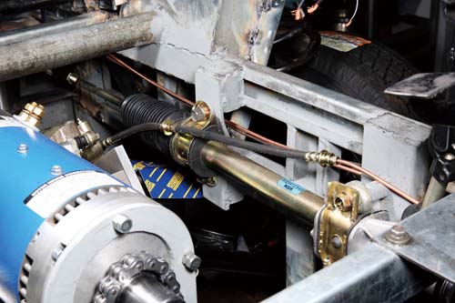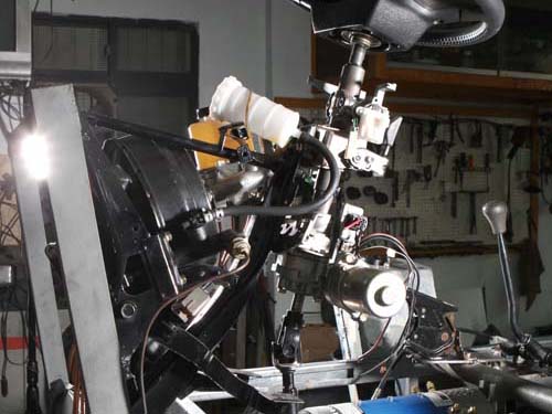從此部水陸兩用車的施工過程中,可看出許多柯氏汽車展現訂製功力之處,除了前後輪煞車系統修改到變速箱與差速器兩側之外,採訪當天可看到方向盤機構已經完成,而且擁有動力泵的輔助,向下一看,方向機竟然是放直的,而非一般車輛直接連接左右兩輪的方式,正因為所有的機件都不碰水,所以各位可以注意到所有機件都在骨架內(未來包於船體之內),加上差速器與馬達也占掉方向機的位置,於是柯氏汽車利用轉接座連接左右兩輪,克服了上述問題。至於下水之後的轉向機構會是如何,此部分並非柯氏汽車所負責,所以無從得知。