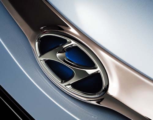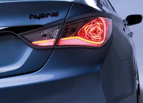 | 車廠通常會在Hybrid車型的外觀玩點花樣,用以強調不同身份,Hyundai Sonata Hybrid更是玩很大,只不過廠徽設計就有點抄襲嫌疑 |