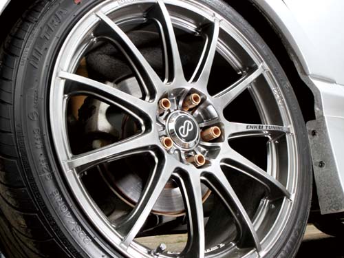 除了上述提及的部分之外,Tuner為了更好的抓地性能與外觀視覺效果,改裝18吋Enkei S22鋁圈配上Sonar SX-1 225/40ZR18輪胎,而煞車系統仍保留原廠設定。