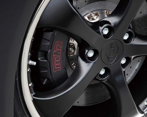 | Techart不忘在消光黑之中加入其他元素點綴,像是紅色Techart字樣的卡鉗就有畫龍點睛的功效。 |