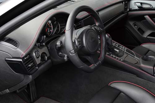 這部令人著迷的Panamera全車採用消光黑的塗裝,與Techart空力套件整合於一體,整車黑到只能看到前保桿的日行燈以及車尾的尾飾管,三片式設計的前保桿下擾流板可提供充足的下壓力,車尾也加入了上、中擾流板的設計,提昇高速行駛的穩定性。22吋Techart輕量化鋁圈讓Panamera看起來更加飽滿,展現強烈的肅殺之氣,而紅色字樣的煞車卡鉗有畫龍點睛的效果。
