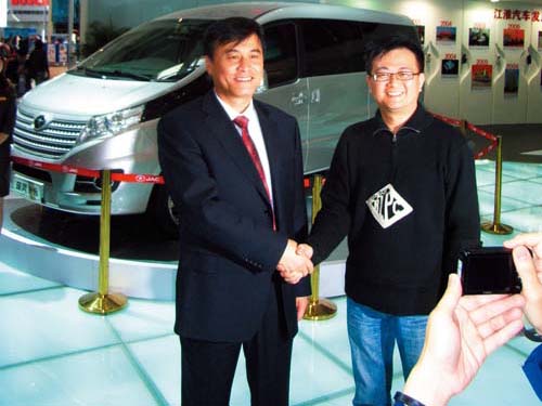 | 江淮汽車總經理安進與台灣「勝榮汽車」連執行長於車展上宣布,江淮輕卡將於年底進軍台灣市場 |