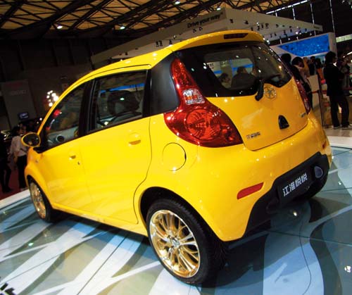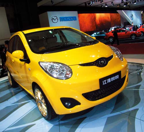 | 江淮汽車於2007年首度涉足「乘用車」領域,其第一輛轎車產品為「賓悅」,圖為其最新迷你小車-悅悅;車長3.5米、排氣量1.1升、配置「五速自手排」變速箱,新車預計第二季上市、售價約5萬人民幣 |