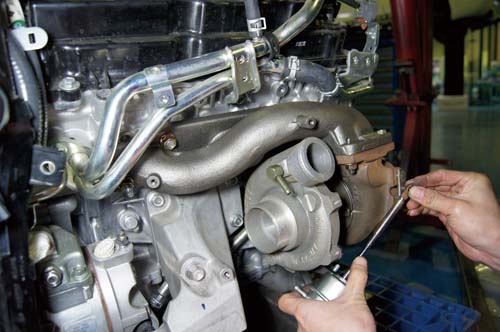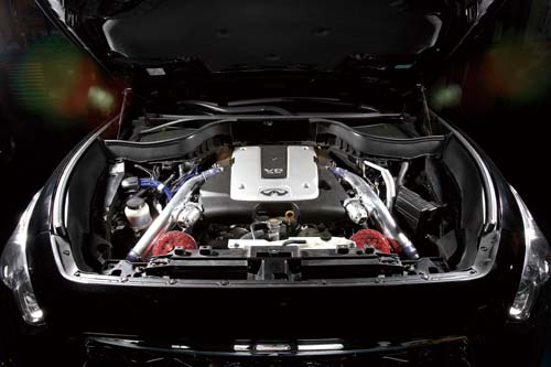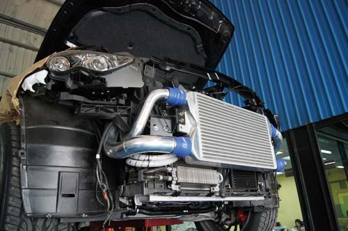 車主對於機械增壓沒有什麼興趣,在日後也有打算提昇排氣量及強化自排變速箱的預定下,最後決定以雙渦輪增壓來提昇動力,不過日本HKS目前尚未推出FX35專用的渦輪套件,原因很簡單,因為當地沒有這款市售車,因此車主自行由國外帶回一套G35專用渦輪套件委請二哥安裝調校,不過當本體卸下將渦輪裝上,要再將本體放回時問題來了!FX35引擎室內空間及傳動系統的不同,導致渦輪本體會卡到車體,管路部分更不用說,角度根本完全無法對應在FX35上,因此二哥只保留下鑄鐵芭蕉及雙節氣門專用前製中冷器部分,其餘的渦輪機及管路部分則另外再加以選擇。