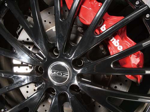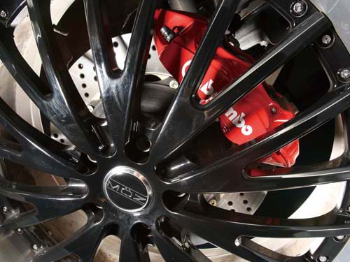 | 鋁圈部分為了更爆炸性的視覺效果,採用美國MOZ 22吋多片式鋁圈,搭配四輪285mm的22吋超大腳,另外圈內Brembo F 6pot/R 4pot的卡鉗及加大碟更是讓視覺效果大爆炸,對於這輛超過兩噸的怪獸來說,這樣的制動系統也只是堪用而已 |