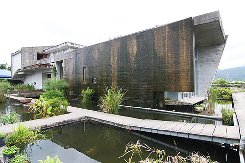 而水草文化館是宜蘭厝的代表建築之一,將建築沒入水池以降低對環境的影響,與園區的水生池融為一體,主要介紹國內常見之水草,及水草對大自然以及人類生活的影響,生態球的原理介紹與水草相關商品。