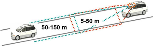 然而攝影機跟人眼一樣無法瞻前又顧後,單一攝影機無法即時辨識近距離與遠距離的物體,為了解決此一問題,車輛中心以雙鏡頭分工的作法,做雙視覺的監控與影像整合分析,一個看遠方(50-120m)、一個看近端(5-50m),再結合車道偏移警示功能,偵測前方全視野、安全係數也更高。