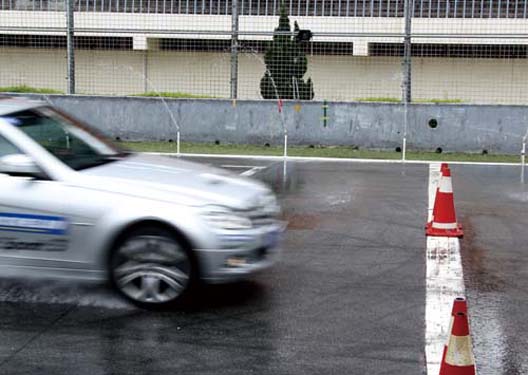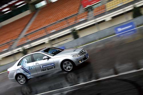 特別強調安全的Pilot Sport 3,對於瞬間急停煞車距離同樣也是一般駕駛在行車可能遇到的突發狀況,這同樣也是Michelin引以為傲的進化項目之一,為了讓濕地急停測試有更為公正的比較,現場同樣安排兩部C200K試駕車,車內均安裝P-Box進行80-10km/h的煞車距離測試,此外現場同時還安排B牌同級產品進行比對。