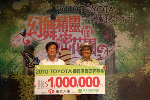 2010年TOYOTA守護蝴蝶物語-幻舞精靈的秘密花園活動7月3日(六)於動物園盛大舉行開幕式,今年為TOYOTA連續第三年與臺北市立動物園共同舉行蝴蝶月活動,除透過舉行各式活動,大力推動環保及生態保育觀念外,更以三年參佰萬的經費,持續支持臺北市立動物園研究團隊進行臺灣蝴蝶生態研究工作,開幕記者會中,由和泰汽車車輛營業本部本部長劉源森代表TOYOTA捐贈動物園研究團隊壹佰萬研究經費,和泰汽車車輛營業本部本部長劉源森表示:「蝴蝶為臺灣珍貴的國寶,對於生存環境的敏銳度高,TOYOTA長期推廣蝴蝶保育觀念,主要希望能喚醒民眾對於環保的重視。」劉源森本部長同時以蝴蝶為例,提到在今年一連串的事件中,期許TOYOTA對於品質的要求能像蝴蝶對與環境的要求一樣敏銳,能夠透過不斷的要求與改進,為顧客提供更好的產品及服務。