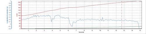 | 車主採順順的加速模式,因此0.394G的最大G值在112.18公里浮現,換檔部分似乎也花費過久時間,如果能提昇換檔技術,想必可在減上1秒也不是問題。3檔換4檔:0.58秒 4檔換5檔:0.94秒 |
