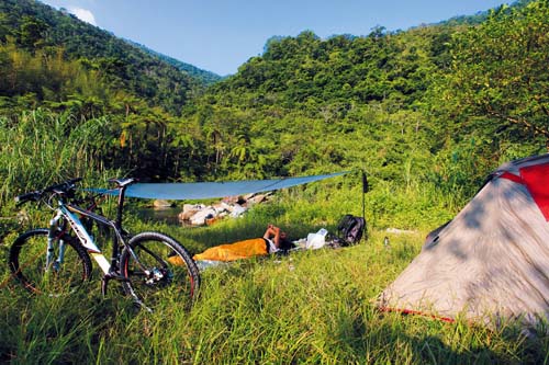 除了一頂二人帳之外,以二輛單車的座椅高度當作營柱,我們另外架設一片超輕防水布當作天幕,可以擋住露水,就在天幕下野炊、休息,我再搭配露宿蚊帳就在野地上睡得非常安穩。夜裡,戴著頭燈可輕易發現水邊豐富茂盛的各類水族,尤其蛙類、溪蝦與溪蟹,苦花也不少但體型超小(可能最近被電過),只有絕對無污染的水質才有這些生物的存在。簡易的晚餐之後,我們踩在冰涼的水中不斷的拍攝精彩的生態畫面,愈發覺得這兒真是一座天然的生態教室,希望能夠長久保持下去。這個晚上,就在水聲潺潺中逐漸睡去。