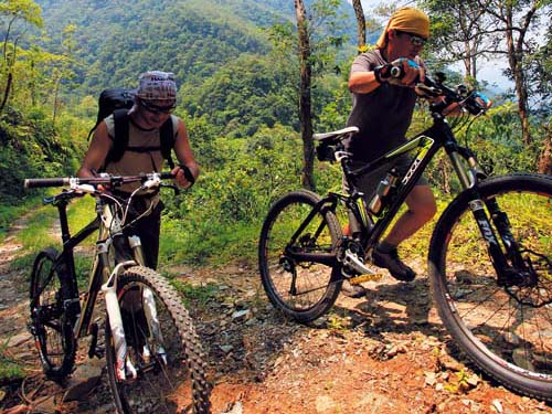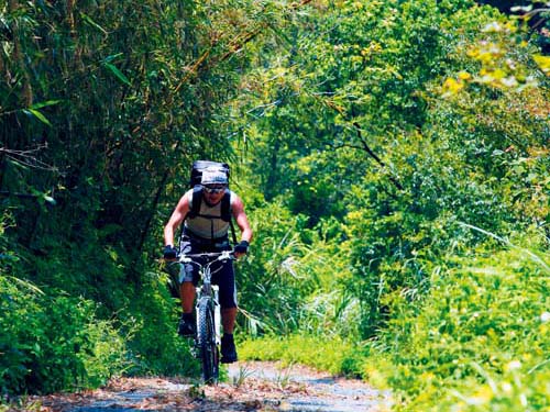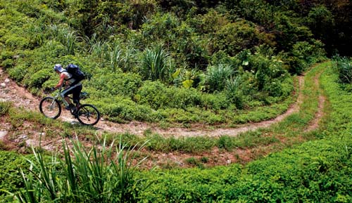 | 辛苦的長上坡,其實奮力踩踏不久就得下來推車了。 |