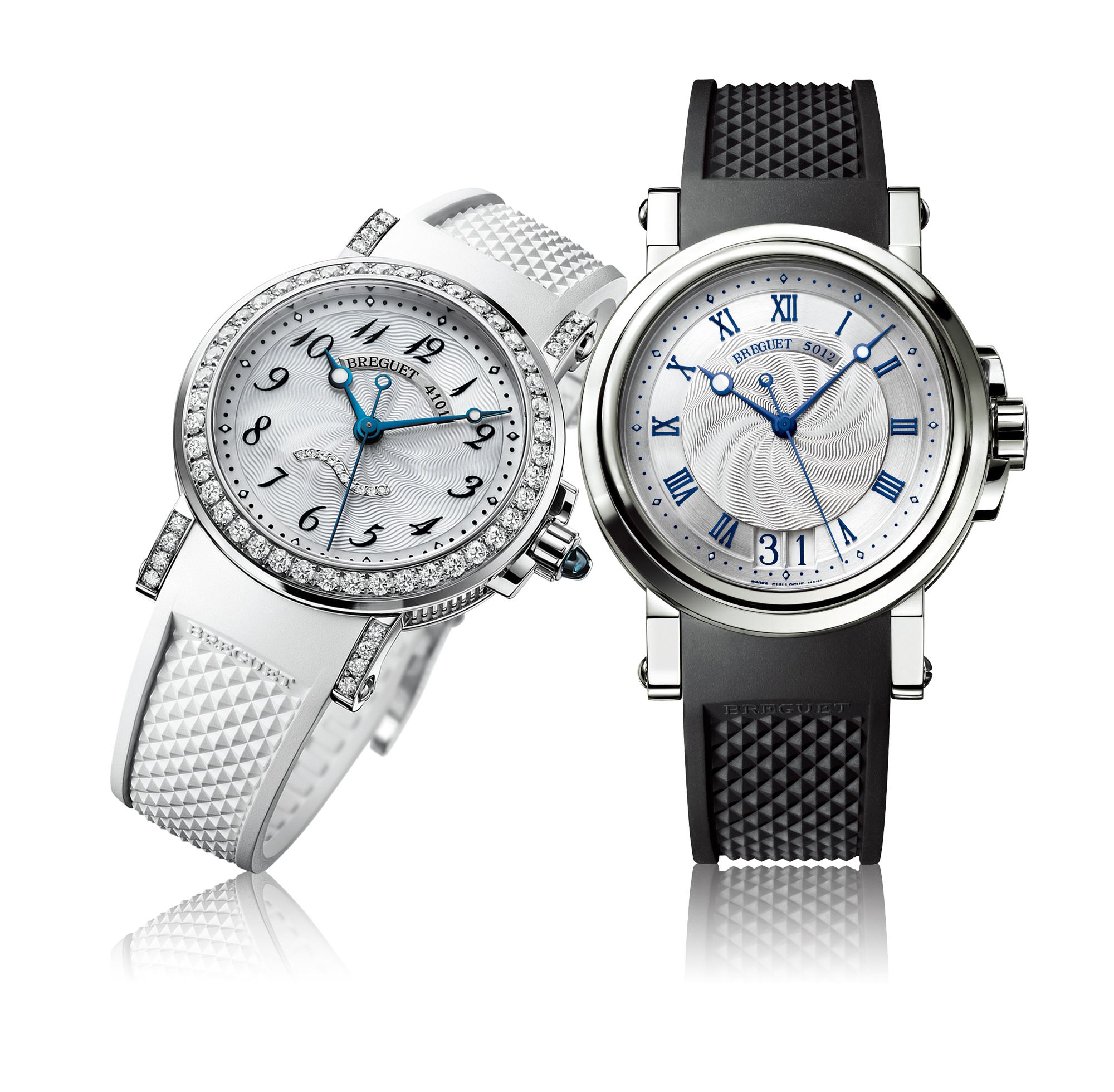 Marine系列堪為集運動的優雅及性能於一身,滿足了當代的需求,搭載寶璣品牌的經典設計,將優雅運動風格發揚地淋漓盡致。Marine系列情侶對錶採用最純粹簡單的黑與白色調,演繹清新的夏日表情,圓形錶殼糅合簡約分明的輪廓,錶盤中央的手工鐫刻波浪飾紋,彷佛流動中的海洋展現微妙和諧的動態美感,銀光流轉中所激起的層層漣漪,像是夏日情愫慢慢地滋生,在此刻記錄下彼此的愛戀。搭配時尚黑白色系的橡膠錶帶,絕對是讓人眼前一亮的情侶對錶選擇。