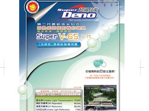 安能公司在十年前率先推出SUPER V-65一代,不影響GSP、ETC超高效能前擋膜,經歷數萬人使用見證,獲得客戶高度肯定外;今年,丹龍隔熱紙更推出SUPER V-65二代,除穩定高效能特性不變之外,SUPER V-65二代更以更淺的顏色(更安全),更高的隔熱(隔熱效果提升20%),終於達成安全、舒適、隔熱兼具的極致前擋膜產品。因此,敢說丹龍SUPER V-65二代是目前市場上最好的汽車前擋隔熱膜。