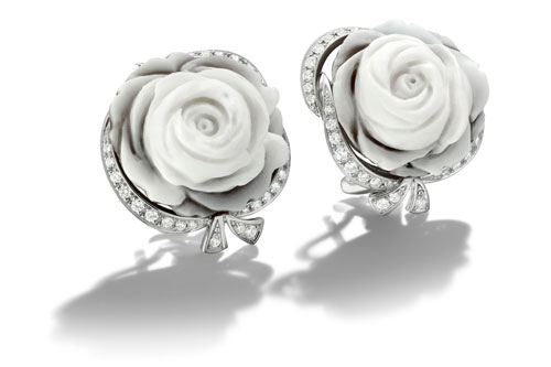 寶璣高級珠寶La Rose de la Reine系列,以當代設計重現洛可可藝術風格,此件珠寶組的取擷自貝殼溫潤的色調,藉由精緻雕工表現出含苞待放的花蕾,層層柔白花瓣宛若包覆著萬般珍視及寵愛之情,綴以精巧可愛的蝴蝶結,周圈環繞目眩神迷的鑽石之海,烘托出純潔愛情的寓意。
