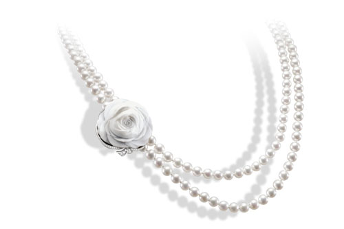 Akoya珍珠項鍊搭配一只玫瑰貝殼浮雕胸針,可與項鍊一同佩戴或單獨作為一件珠寶飾品。此外,精緻的玫瑰浮雕也是一對美麗的耳環中的唯一主角;而從寶璣經典Reine de Naples系列汲取靈感所設計的戒指,則為此件充滿溫潤美感的珠寶組成就最完美的一筆,此一精巧優雅的珠寶系列,是禮讚六月新娘的幸福獻禮。