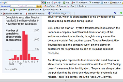 真相大白,美國華爾街日報7/13(二)報導美國交通部對於豐田車暴衝事件的初步調查結果,這起報導引用美國交通部分析數十起Toyota及Lexus汽車暴衝車禍的「行車資料紀錄器」顯示,幾乎所有汽車的油門全開、卻完全沒有使用煞車的跡象,顯示事故發生時駕駛者腳踩油門踏板、而非煞車踏板。